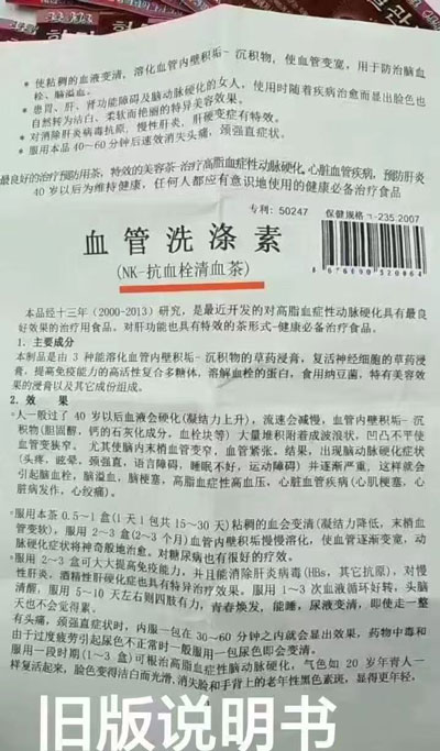 人一般过了40岁以后,血液会硬化(凝结力上升),流速会减慢,血管内壁积垢-沉积物(胆固醇,钙的石灰化成分,血栓块等)大量堆积附着成波浪状,凹凸不平使血管变窄。尤其使脑内末梢血管变窄,血管紧张。结果,出现脑动脉硬化症状(头疼、眩晕,颈强直,语言障碍,睡眠不好,运动障碍)并逐渐严重,这样就会引起脑血栓,脑溢血,脑梗塞,高脂血症性高血压,心脏血管疾病(心肌梗塞,心脏病发作,心绞痛)。服用本茶0.5-1盒(1天1包,共15-30天)粘稠的血会变清(凝结力降低,末梢血管变软),服用2-3盒(2-3个月)血管内壁积垢慢慢溶化,使血管逐渐变宽,动脉硬化症状将神奇般地治愈。对糖尿病也有很好的疗效。服用2-3盒可大大提高免疫力,并且能消除肝炎病毒(HBs,其他抗原),对慢性肝炎,酒精性肝硬化症也具有特异治疗效果。服用1-3次,血液循环好转,头脑清醒,服用5-10天左右则四肢有力,青春焕发,能睡,尿液变清,即是走一整天也不会觉得累。有头痛,颈强直症状时,内服一包在30-60分钟之内就会显出效果,药物中毒和由于过度疲劳引起尿色不正常时,一般服用一包尿色即会变清。